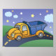 This whimsical transportation themed illustration features a yellow and blue dump truck driving down the road under a starry sky. Available on prints & decor for your child's room or nursery. We also offer the dump truck by itself on matching t-shirts & other kids & baby t-shirts.