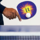 A ping pong paddle featuring a political starburst abstract pattern in red, yellow and blue with the words Dump Trump in the centre. Text can be customised.