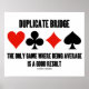 If you play duplicate bridge, you'll enjoy wry bridge humour with this poster featuring the four card suits along with the saying "Duplicate Bridge - The Only Game Where Being Average Is A Good Result". Make others do a double-take at the concept of average and getting to an average game in the world of bridge with this memorable bridge saying poster!