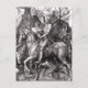 Albrecht Durer Knight Death and the Devil postcard. Woodcut engraving from 1513. One of Northern Renaissance artist Albrecht Durer’s most famous engravings, Knight Death and Devil is an allegorical work featuring a northern European knight riding in full armour on a horse flanked by Death, who holds an hour glass, and the devil in the form of the a goat. The work represents the Christian struggle against time and temptation. A great gift for fans of Albrecht Durer, Northern Renaissance Art, Woodcut Engravings, and knight and mediaeval depictions.