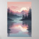A large pale sun sets behind layers of rose-tinted mountains, mirrored perfectly in a still lake lined with quiet pine trees. This tranquil scene evokes calm and serenity, making it an ideal wall piece for lovers of minimal nature art and soothing tones.