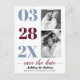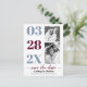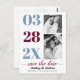 Modern dusty blue and burgundy two photo Save the Date postcard. It showcases the date in dusty blue and burgundy typography in a column and two photos of the couple. The phrase "Save the Date" is in script style typography.