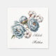A detailed botanical illustration of light blue peonies and white cotton bolls against a pure white background. The peonies are rendered in soft, layered petals with delicate shading and subtle variations in the blue-gray color. Three fully bloomed peonies are positioned in the center-left of the composition, each with detailed stamens and pistils. Three white cotton bolls with brown stems are placed on the right side of the arrangement, showing their characteristic fluffy, ball-like structure. The cotton bolls have small green sepals attached. The illustration has a watercolor-like quality with subtle color gradients and delicate linework. The flowers are arranged in a loose, natural grouping with stems and leaves that are partially visible. The overall composition is balanced and symmetrical, with the flowers filling most of the frame against the stark white background.
