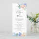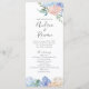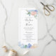 Double-sided wedding programs featuring a romantic dusty blue and pink floral design. Order of ceremony wording is displayed on the front, and wedding party details and a thank you note to guests are on the back.