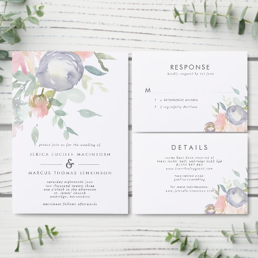 Beautiful wedding napkins featuring watercolor flowers and leaves in dusty blue, pink and green. Your names, large statement ampersand in the centre, and your wedding date, are in dark grey. Matching items are available.