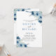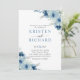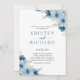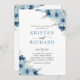 This elegant wedding invitation features hand-painted floral watercolor in dusty blue, grey and green