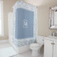 Dusty blue and white damask pattern and square with scalloped borders shower curtain. It showcases a dusty blue square with scalloped borders in the centre with a damask border and your monogram. You can personalise it with your family name and monogram.