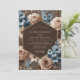 A romantic arrangement of soft blush roses and delicate blue blooms creates a moody and ethereal atmosphere. This design evokes a sense of sophisticated charm with its rich, muted color palette. It features roses and blue hydrangeas.