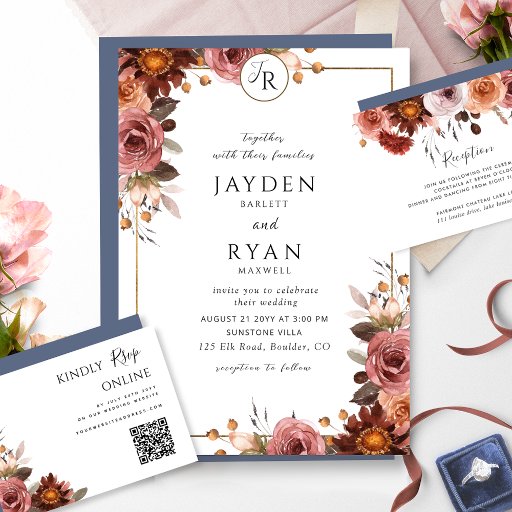 Dusty Blue, Blush Burgundy Floral Wedding Invitation