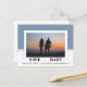 Dusty blue and blush pink colour block wedding Save the Date photo postcard. The upper of this Save the Date design is o dusty blue colour with a blush pink stripe while the bottom is of white with the text. It also features a photo of the couple.