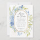Wedding Save the Date depicts a floral design with an elegant gold geometric frame and dusty blue watercolor boho roses and greenery. The back features inspirational quote, "God has led two lives to take one path, encouraged in heart and united in love."