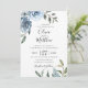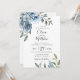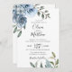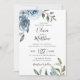 Elegant dusty blue watercolor floral, wedding invitation. Back of card features matching floral design.