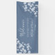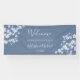 Wedding welcome reception seating chart with blue white cherry blossoms on a dusty blue background. A welcome text and your bride and groom names in an elegant handwritten font.