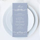 Elegant dusty blue floral border wedding menu with a floral crest and monograms on the back.