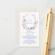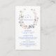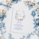 A refined and romantic wedding design featuring a dusty blue monogram crest framed by watercolor florals in pastel lavender, blush, and peach tones. The layout includes soft greenery, elegant serif and script typography, and a timeless format perfect for formal weddings.
