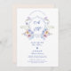 A refined and romantic wedding design featuring a dusty blue monogram crest framed by watercolor florals in pastel lavender, blush, and peach tones. The layout includes soft greenery, elegant serif and script typography, and a timeless format perfect for formal weddings.