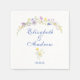 A refined and romantic wedding design featuring a dusty blue monogram crest framed by watercolor florals in pastel lavender, blush, and peach tones. The layout includes soft greenery, elegant serif and script typography, and a timeless format perfect for formal weddings.
