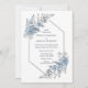 A dusty blue elegant wedding invitation featuring fern leaves and daisies held by a simple faux glitter wireframe. RSVP information has been included in this information for your guests to remind them to respond.