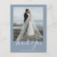 Wedding thank you postcard features an elegant script font with a modern and clean typographical design with a dusty blue background. This card is ready for you to customise with your own photo and details.
