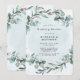 Design features a printed coloured foliage element in shades of light green and dusty blue. Blue green watercolor canvas textures with calligraphy script or type writing. Great for your wedding celebrations!