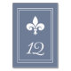 Elegant and simple Wedding Table Card featuring a fleur de lis against a dusty blue background. This design is a unique choice for a modern wedding. Easy to customise with the appropriate table number(s). Click "Customise It" to find more personalisation options.