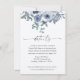 A beautiful dusty blue floral wedding details card with watercolor flowers, black text along with solid dusty blue background.