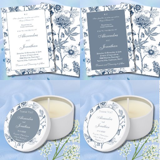 Add a touch of timeless charm to your special day with this personalized French Wedding Program, designed to beautifully complement a romantic and refined ceremony. This vintage floral wedding design features delicate dusty blue flowers, soft botanical leaves, and graceful butterflies, all set against a crisp white background for a look that is both classic and elegant. Inspired by the artistry of toile de Jouy, this program blends traditional French aesthetics with a modern twist, making it perfect for a garden wedding or an elegant outdoor celebration. The calligraphy script font enhances the sophisticated feel, guiding your guests through the order of service with grace and clarity. Whether your wedding is held in the French countryside or simply styled to reflect its romance, this wedding ceremony program offers the perfect balance of beauty and function. A timeless keepsake for your guests to cherish.