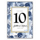 Rustic dusty blue pattern surrounds a gold frame. The table number is written in a large and elegant serif font. The wedding couple names are below and their wedding date. Change the card number and all other text very easily.