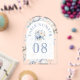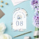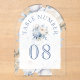 Elegant dusty blue wedding table number card featuring beautiful flowers.