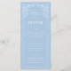 Delicate white blossoms intertwine to create a beautiful floral frame, embracing the timeless elegance of love. This exquisite wedding menu captures the essence of modern aesthetics and classic romance with its harmonious blend of delicate blooms and elegant typography. Against a captivating backdrop of solid dusty blue, this menu sets the stage for a truly enchanting celebration of love.