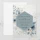 This design evokes a serene winter wonderland with soft, ethereal blue and gray floral elements and frosted foliage. Delicate blooms and subtle botanical details create a dreamy, romantic atmosphere perfect for a cool-toned celebration.