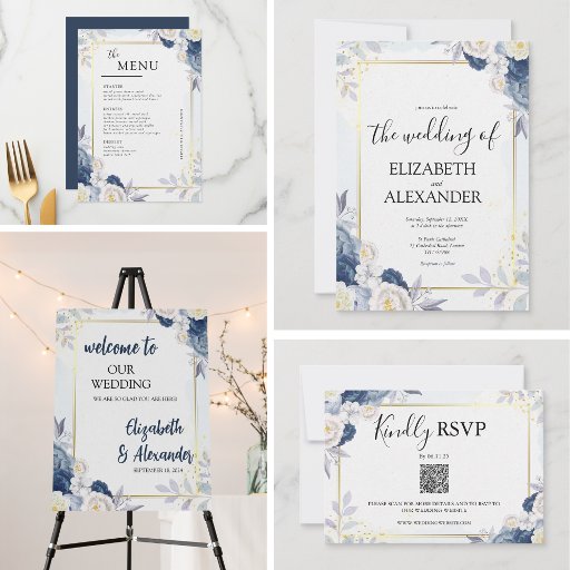 This beautiful wedding invitation suite features an elegant blend of soft blue and white florals, framed by delicate gold accents. This design captures a sense of romance and sophistication, perfect for couples seeking a classic, timeless look for their wedding stationery. The set includes a customisable wedding invitation and various matching products, such as RSVP cards, thank-you notes, menus, and more.