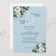 An elegant wedding invitation with dusty blue and gold glitter flowers and elegant calligraphy that you can customise with your details.