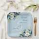 This elegant Dusty Blue Gold Glitter Floral Wedding paper plate can be personalised with your names and wedding date.