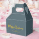 Surprise your holiday party guests with these Dusty Blue Gold Merry Christmas Script Custom Favour Boxes. This simple and elegant design has the customisable greeting "Merry Christmas" in faux gold trendy hand script lettering on the middle front of box. The background is dusty blue and you can change to any colour. Personalised with family name or your custom text in simple print lettering.