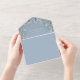 All in one wedding invitation featuring pretty watercolor greenery foliage and elegant modern typography on a dusty blue background. The invitation includes a perforated RSVP card that features your wedding website QR code. Designed by Thisisnotme©