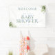 An elegant baby shower welcome banner sign featuring pretty dusty blue greenery lettering. Designed by Thisisnotme©