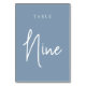 Simple and chic table number cards in Dusty Blue and white make an elegant statement at your wedding or event. Design features "table [number]" in an eyecatching mix of classic serif and handwritten script lettering. Design repeats on both sides. Individually numbered cards sold separately; order each table number individually from our collection.