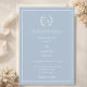 A dusty blue colored background decorated with a hand drawn crest, wreath. Warm ivory colored frames and text. Personalize and your monogram initials, names and details.
