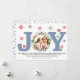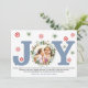 Dusty blue Joy and Christmas floral wreath photo Holiday Card. It showcases the word "JOY" in dusty blue with red and green snowflakes while instead of the letter "O" there is your photo in a floral Christmas wreath frame. The back includes dusty blue polka dots confetti.