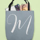 A simple, nice and monogrammed dusty-blue tote bag for a stylish woman... front side: big script initial... back: her name in the same handwritten font style