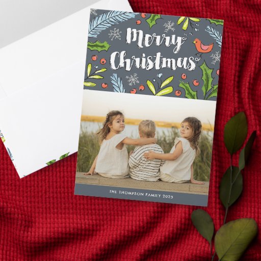 This illustrated flat holiday card features an illustration of hand-drawn blue spruce, holly and mistletoe branches around inky style Merry Christmas writing. Personalise the back with your family photo, a customised message and names.