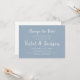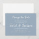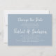 Modern minimalist change the date wedding postponement cards feature handwritten brushy script in dusty blue and white colour, simple and stylish.