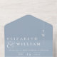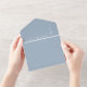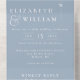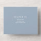 This all-in-one minimalist wedding invitation features modern typography on a dusty blue background. The invitation includes a perforated RSVP card with your wedding website QR code. Designed by Thisisnotme©