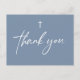 Customise this baby boy, dusty blue thank you postcard with your thoughtful message, names and return address. Modern typography script with a simple white cross detail.