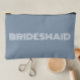 Solid dusty blue colour, small style, zippered cosmetic bag for your wedding bridesmaid that features the word, BRIDESMAID in large, modern typography on one side of bag. Perfect as a travel accessory pouch to hold makeup, perfume, and jewellery. You may personalise by adding bridesmaid name if desired to pouch. Available in many, popular bridesmaid wedding theme colours.