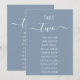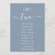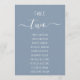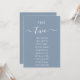 In the upper part, there is the table number written in a handwriting script and the word Table above, in smaller caps (hand letters). Under them, there are the 10 guest names, in similar hand letters. The background is dusty blue, all text is white.