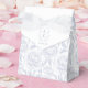 Dusty Blue Monogram Crest Wedding Favour Box: Vintage-inspired line art monogram crest with elegant typography. Add first initials for a custom wedding crest. Features a chinoiserie floral pattern of peonies for timeless sophistication.