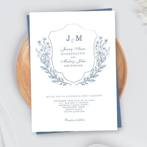 Elegant and minimal monogram crest and floral line art design Wedding envelope. Features a beautiful crest and floral leaf line art design in a beautiful dusty blue colour. Ready for you to customise with your initials and name and address details, or delete the name and address text to leave blank. Please browse the Monogram and Floral Crest Wedding Suite for matching products.