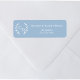 A dusty blue colored background. Decorated with a white wreath. Personalize and add your names, address and your first name initials. White text.